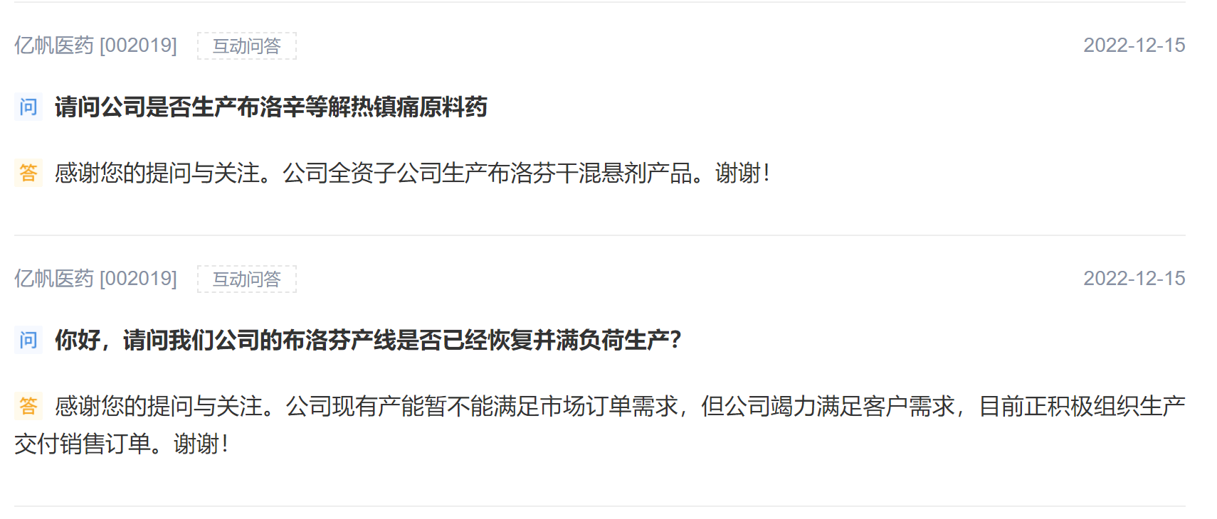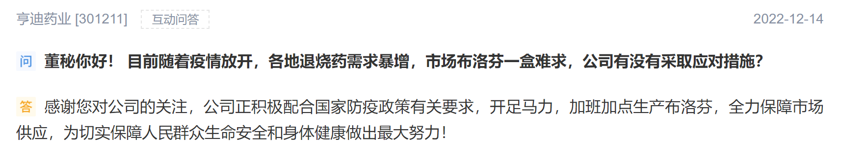 除了新华制药,A股上市公司中,还有一些药业公司加足马力生产布洛芬等市场急需药品。亿帆医药12月15日回应投资者提问称,公司全资子公司生产布洛芬干混悬剂产品;此外,公司还回应从称,现有产能暂不能满足市场订单需求,但公司竭力满足客户需求,目前正积极组织生产交付销售订单。12月14日,亨迪药业回应称,公司正开足马力,加班加点生产布洛芬,全力保障市场供应。