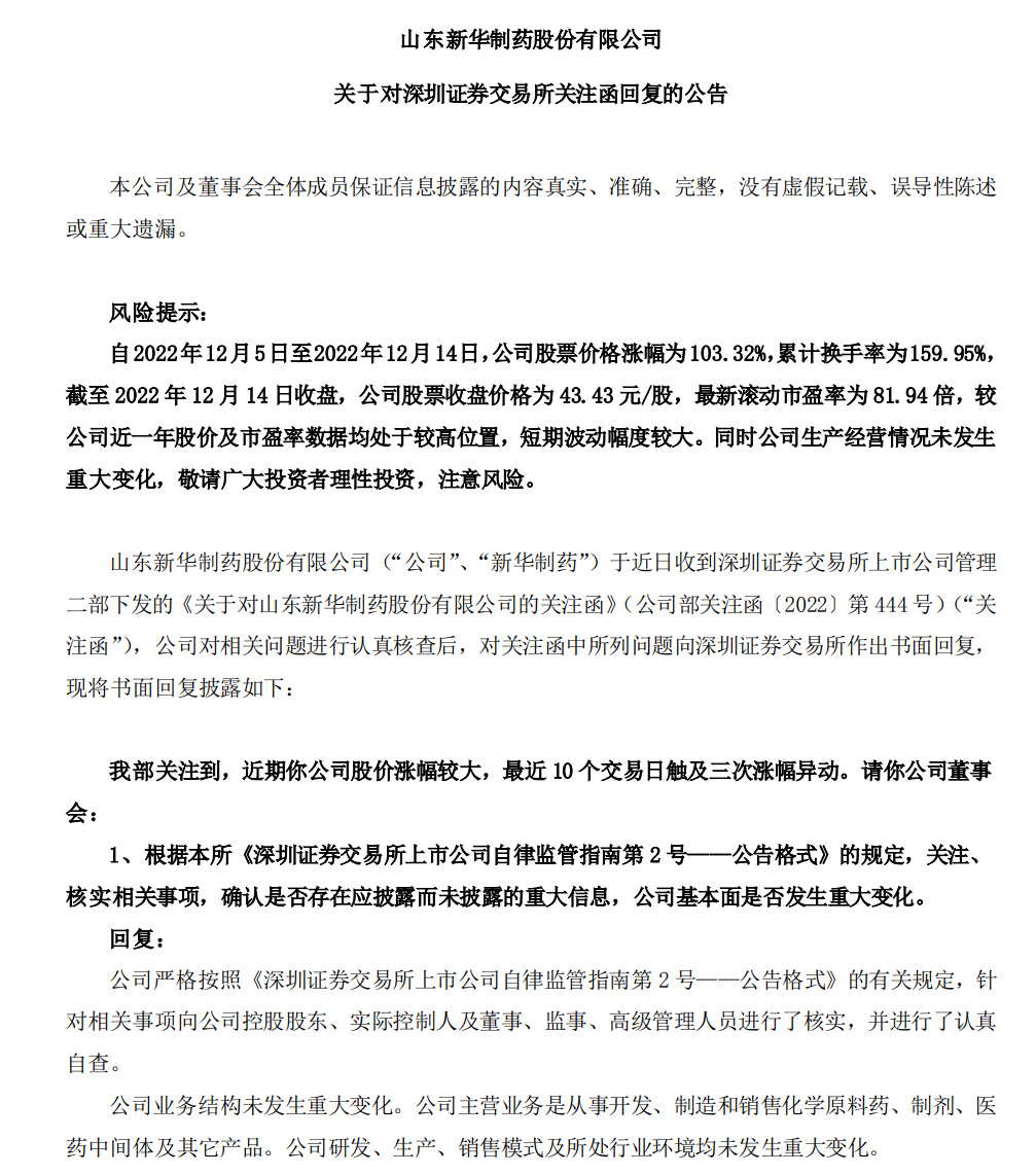 12月16日,布洛芬原料药龙头新华制药股价收于46.1元,刷新上市以来新高。这相较12月2日的收盘价21.36元,半月不到股价已涨116%。公司股价异动引发监管关注,新华制药12月16日晚回应深交所关注函。