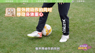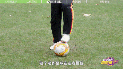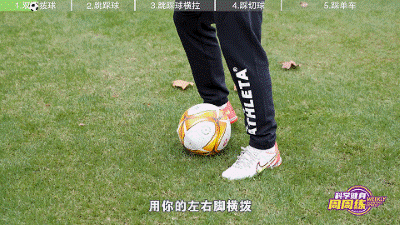 把球放在两腿之间,脚尖向前,前脚掌着地,脚后跟不要落地,微微翘起,用左右脚横拨。尽量把头抬起来,用余光观察球。