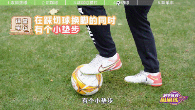 目视前方,保持身体平衡,在踩切球换脚的同时,做一个小垫步的动作。