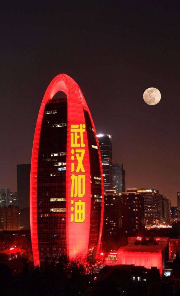 元宵佳节,南京的新街口、新模范马路、河西双子塔、河西金鹰、南京市政服务中心、江苏广电荔枝广场等,纷纷亮灯,为武汉加油,为中国加油。我们同心奋战,共待春暖,坚信明月照远,灯来夜尽!