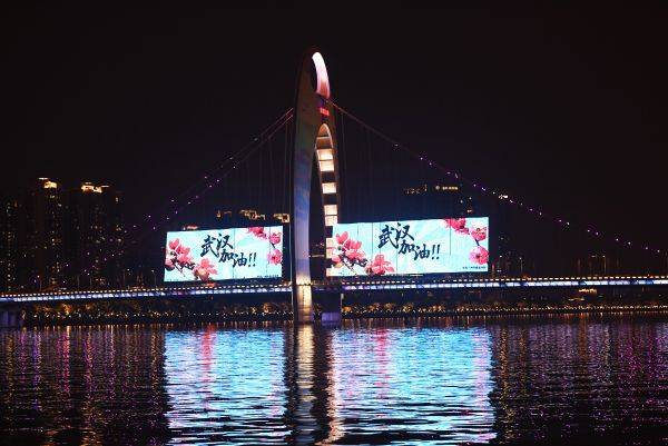 2月8日晚,在美丽的广州,珠江北岸沿江路上的24栋建筑亮起光幕,在广州的多个地标,从广州塔、海珠桥到猎德大桥,都用亮灯方式为武汉加油。 羊城晚报记者 林桂炎 摄