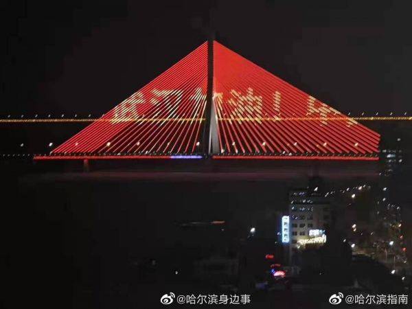 哈尔滨松浦大桥灯光亮起了“中国红” 灯光秀,醒目亮出“武汉加油、中国加油”字幕!哈尔滨用这种特殊方式应援! 图片来源:哈尔滨身边事 微博