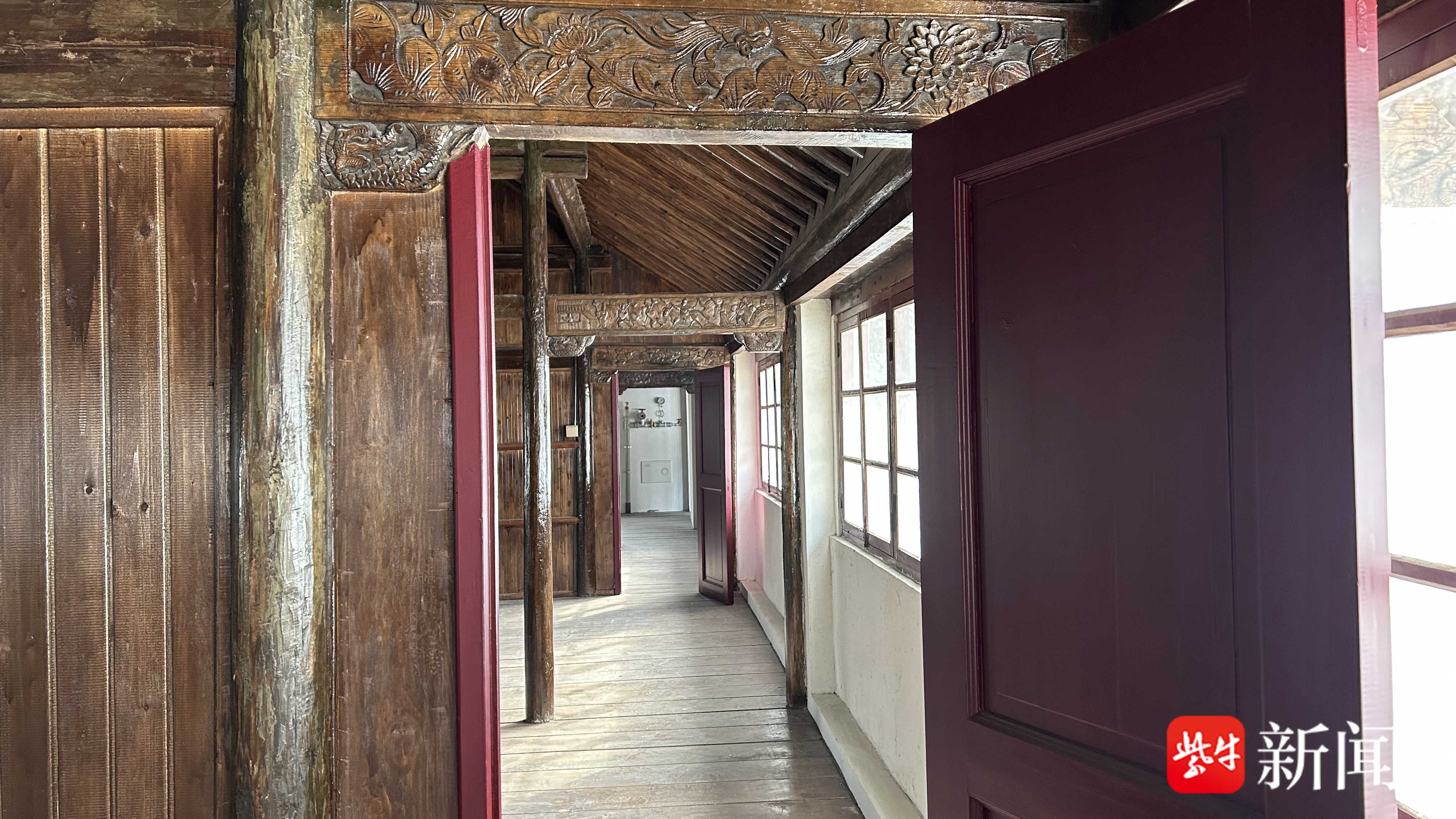 二层屋内,雕花房梁在修缮中按原貌恢复
