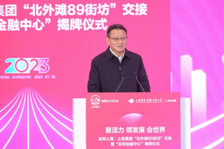 2023年1月6日,友邦人寿保险有限公司(以下简称“友邦人寿”)与上海实业(集团)有限公司(以下简称“上实集团”)共同举办了以“聚活力,领发展,会世界”为主题的“北外滩89街坊”交接暨“友邦金融中心”揭牌仪式。上海市委常委、虹口区委书记郭芳,虹口区委副书记、区长吕鸣,虹口区委常委、副区长周嵘,虹口区副区长陈帅,友邦人寿首席执行官张晓宇,友邦人寿首席财务官吴浩礼,友邦人寿首席投资官陈佳,上实集团总裁周军、副总裁黄海平、徐有利,上实集团旗下上实发展(600748.SH)董事长曾明、总裁徐晓冰,森大厦(上海)有限公司总经理叶一成等嘉宾出席本次活动。友邦保险集团首席执行官兼总裁李源祥通过视频方式致辞。
