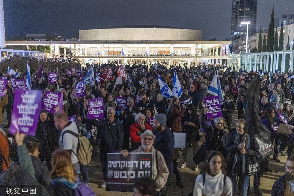 当地时间2023年1月7日,以色列,抗议者在反对新政府的示威活动中举着横幅和旗帜。视觉中国 图