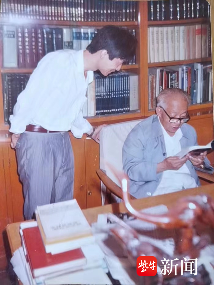 1990年7月1日,陈丕显同志在中南海向肖锦朝同志介绍他著的“苏中解放区十年”回忆录,并签字赠送给肖锦朝。
