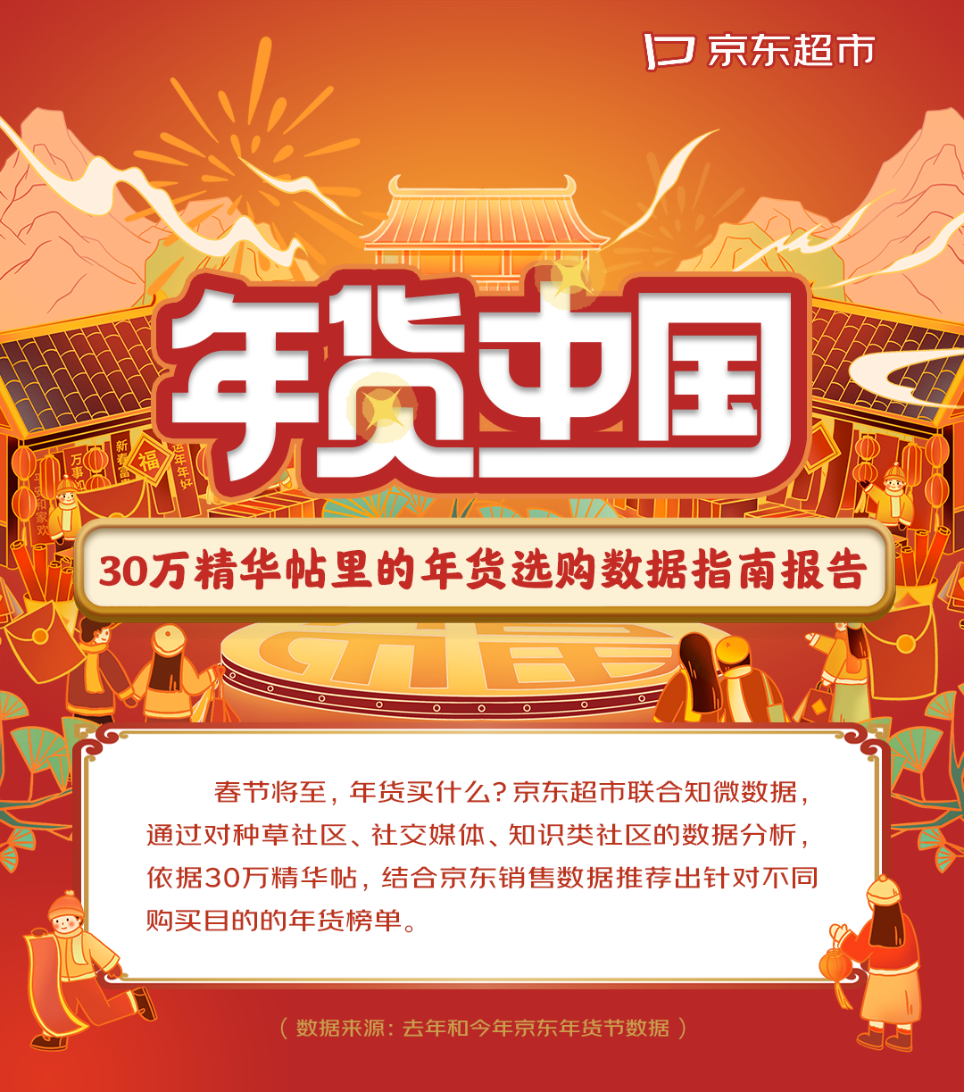 京东超市联合知微数据,通过对种草社区、社交媒体、知识类社区的数据分析,依据30万精华帖,结合京东销售数据推荐出针对不同购买目的的年货榜单。