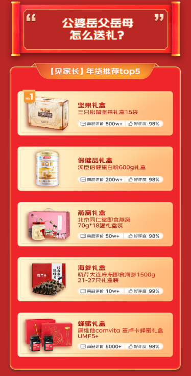 “见家长”时,坚果礼盒、保健品礼盒、燕窝礼盒、海参礼盒、蜂蜜礼盒最受30万达人、答主推荐。其中,三只松鼠坚果礼盒占据推荐首位,在京东超市商品评价数高达500W万,好评度98%。