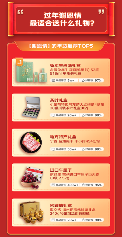 数据分析发现,对于一年中给予帮助的人,30万人“谢恩情”的年货追求得体。兔年生肖酒礼盒、茶叶礼盒、地方特产礼盒、进口车厘子、佛跳墙礼盒5大类年货推荐度最高。排名第一的是舍得兔年生肖酒单瓶装礼盒,在京东超市商品评价数超过5万,好评度97%。