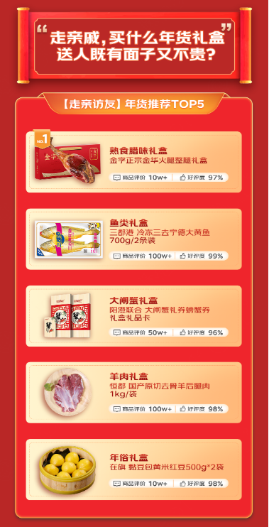 走亲访友时,追求“既有面子又不贵”,熟食腊味礼盒、鱼类礼盒、大闸蟹礼盒、羊肉礼盒、年俗礼盒是30万精华帖中推荐比例最高的五类年货。