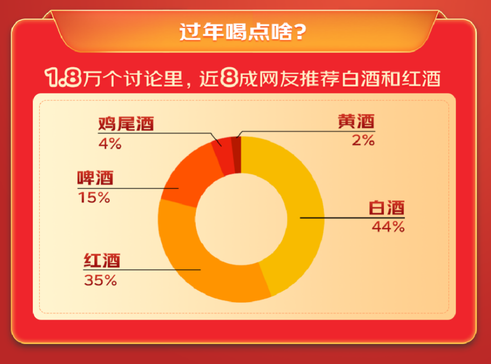 在过年喝什么的讨论中,白酒和红酒分别占比44%和35%,红酒与白酒在年货饮品的竞争中差距已经低于10个百分点。
