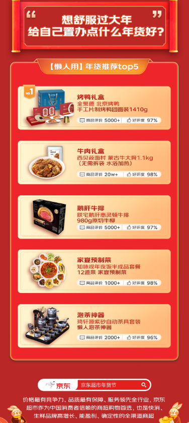 “懒人用”的年货推荐中,30万达人、答主最推荐烤鸭礼盒、牛肉礼盒、鹅肝牛排、家宴预制菜、泡茶神器5类年货。其中,全聚德手工片制烤鸭团圆装是推荐排名第一的年货。