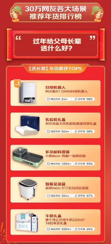 送长辈的年货中,“健康与省心”成为关键词,扫地机器人、乳胶枕礼盒、多功能料理锅、智能足浴盆、牛奶礼盒成为推荐量最高的5类商品。