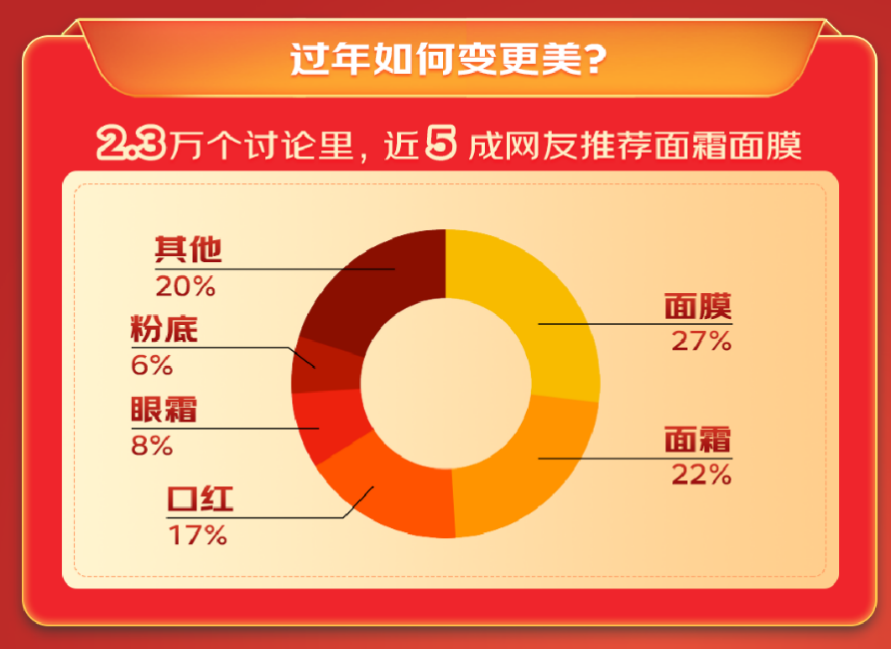 在“过年玩点啥”的讨论中,盲盒最受关注,占比达到50%。在2.3万个“过年如何变美”的讨论中,有49%的网友推荐面霜面膜,排名第一。