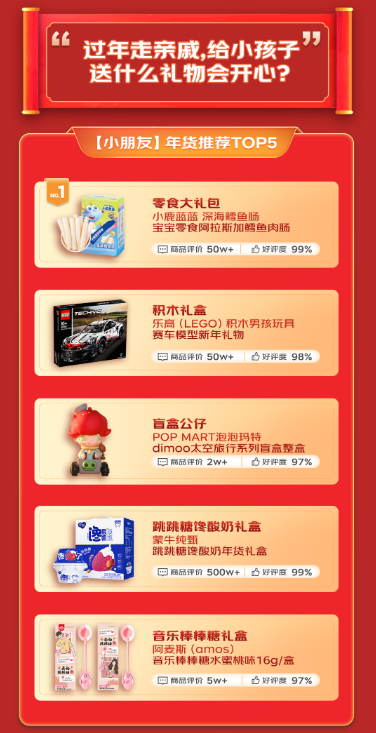 送“小朋友”的年货中,30万精华帖推荐前五名分别是零食大礼包、积木礼盒、盲盒公仔、跳跳糖馋酸奶礼盒、音乐棒棒糖礼盒。