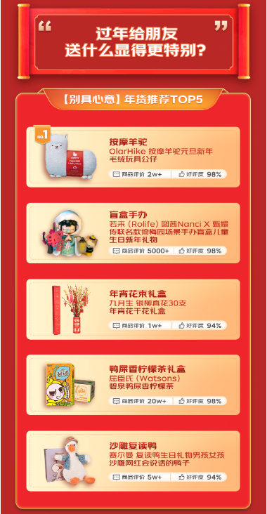 “别具心意”年货榜里,30万精华帖里的达人、答主挖掘出一批与众不同、心意满满的特色年货。按摩羊驼、盲盒手办、年宵花束礼盒、鸭屎香柠檬茶礼盒、沙雕复读鸭占据推荐前5名。