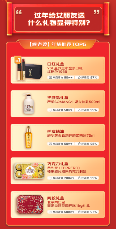 统计分析30万网友精华帖发现,“疼老婆”的年货中,推荐最多的五类商品分别是口红礼盒、护肤品礼盒、护发精油、巧克力礼盒和阿胶礼盒。