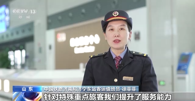 中国铁路济南局济宁东站客运值班员 徐菲菲:针对特殊重点旅客,我们提升了服务能力,成立了特殊重点旅客服务小分队,为旅客出行提供便利。