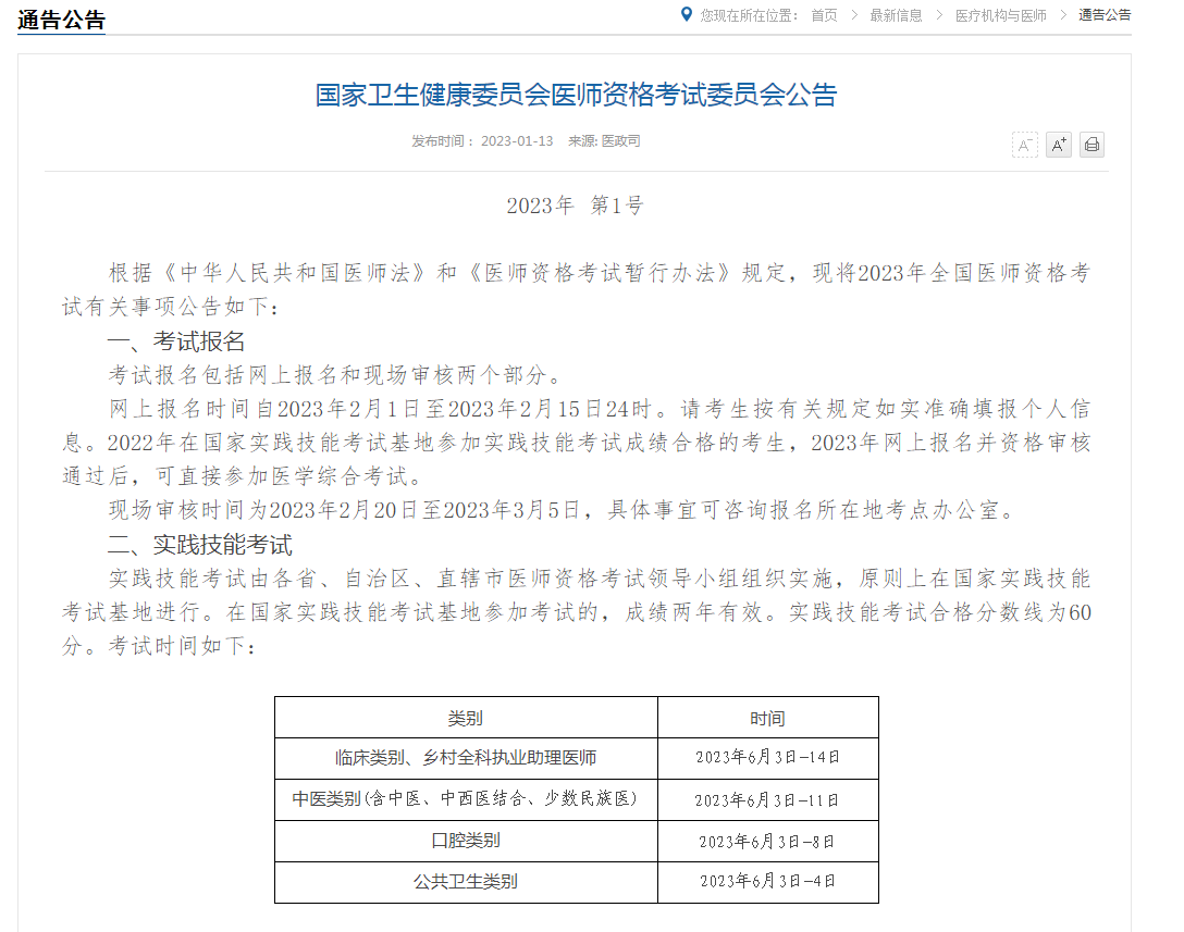 国家卫健委医师资格考试委员会日前发布,2023年全国医师资格考试网上报名时间为2月1日至2月15日24时。现场审核时间为2月20日至3月5日。