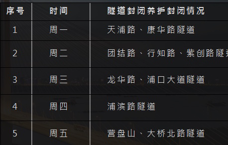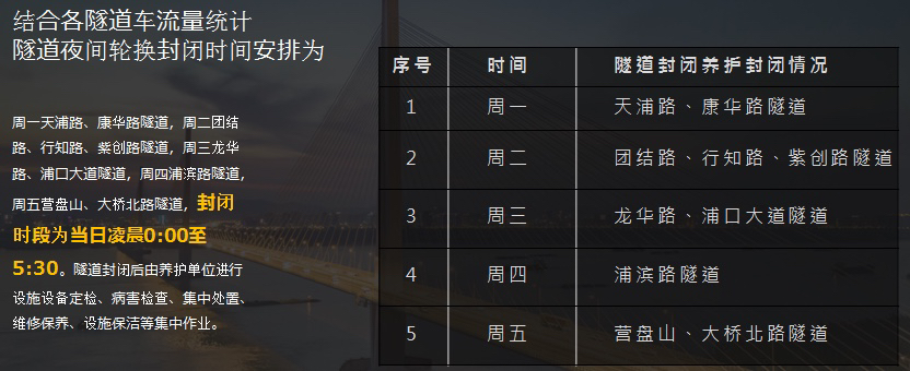 结合各隧道车流量统计,隧道夜间轮换封闭时间安排为:周一天浦路、康华路隧道,周二团结路、行知路、紫创路隧道,周三龙华路、浦口大道隧道,周四浦滨路隧道,周五营盘山、大桥北路隧道,封闭时段为当日凌晨0:00至5:30。隧道封闭后由养护单位进行设施设备定检、病害检查、集中处置、维修保养、设施保洁等集中作业。
