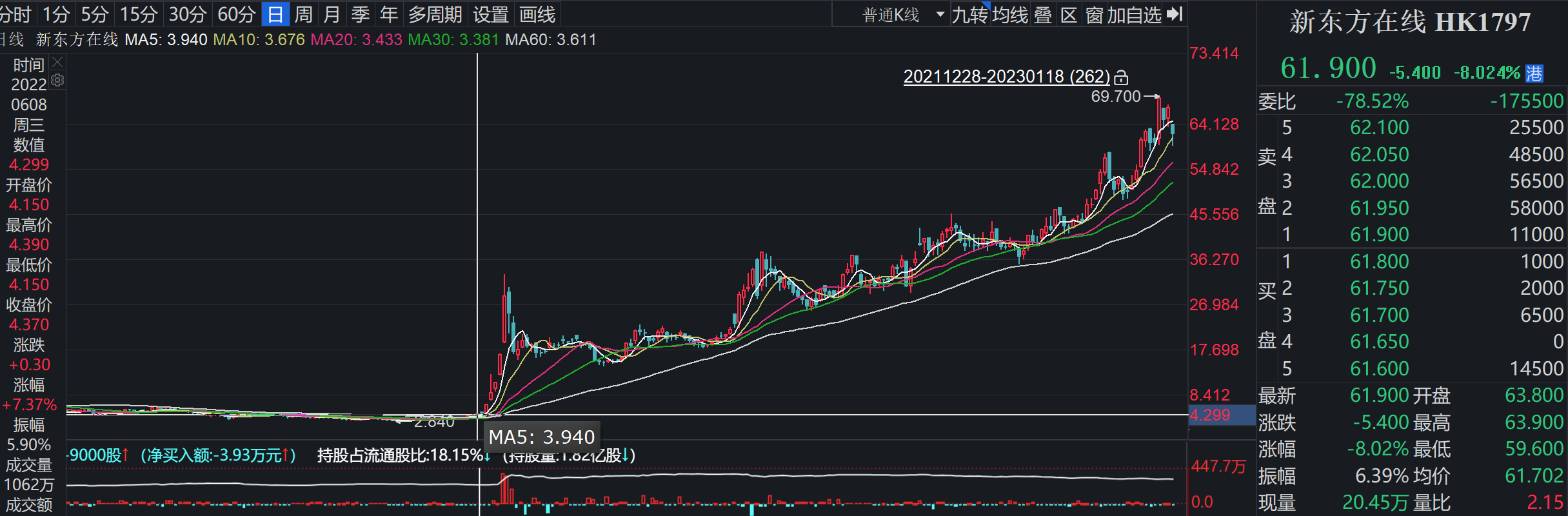 1月18日,新东方在线股价收于61.9港元/股。去年6月以来,新东方在线股价一路飙升,自2022年6月9日至2023年1月18日,新东方在线涨幅达13倍。