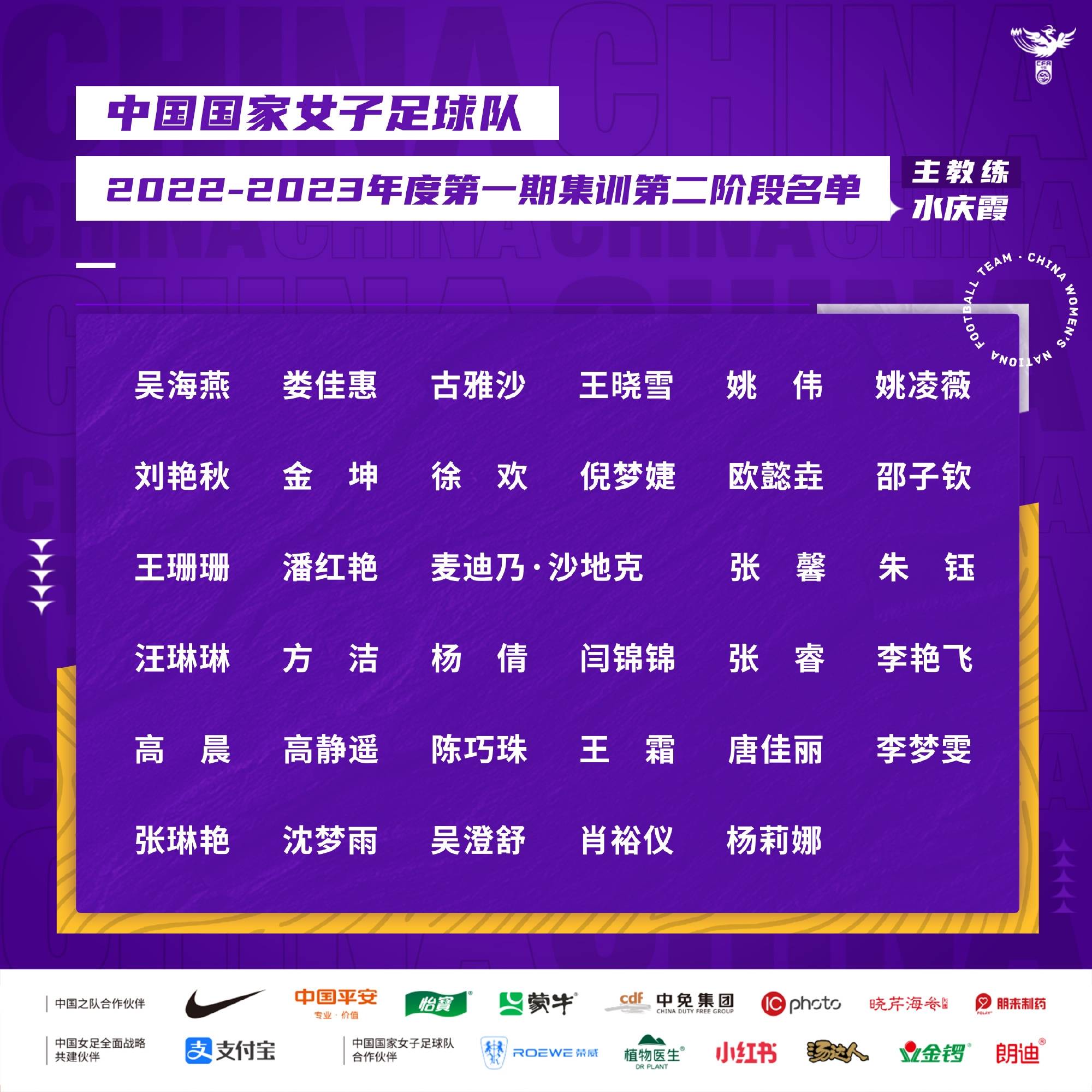此外,入选本次中国女足大名单的球员还包括:武汉车谷江大队的吴海燕、娄佳惠、古雅沙、王晓雪、姚伟、姚凌薇、刘艳秋;北京先农坛体校队的王珊珊、潘红艳、麦迪乃·沙地克;上海农商银行队的张馨、朱钰、汪琳琳、方洁、杨倩、闫锦锦;山东体彩队的张睿、李艳飞;长春九银租赁队的高晨、高静遥;广东梅州客家队的陈巧珠。