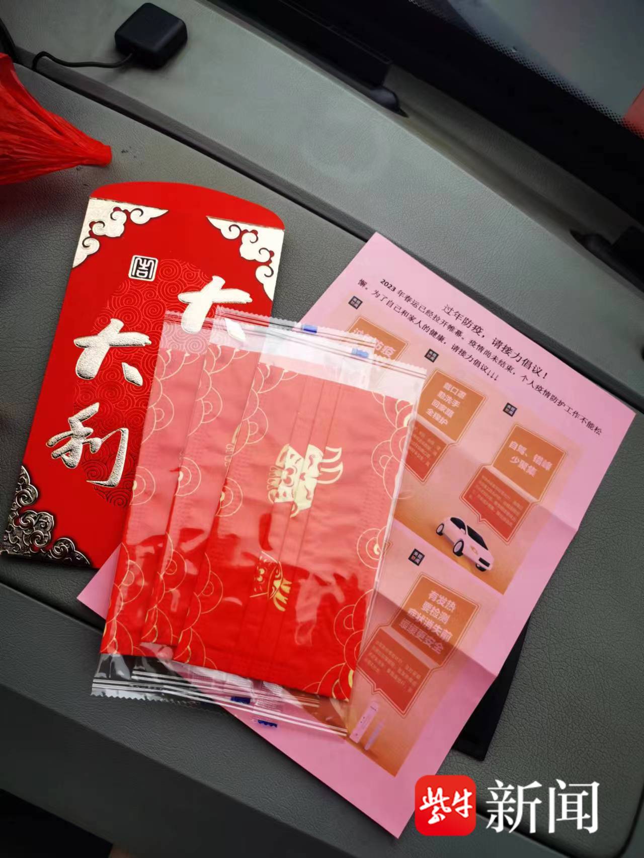 乘客听到这话接过红包打开一看,里面是三个红色的喜庆口罩和一张防疫倡议单:2023年春运已经拉开帷幕,疫情尚未结束,个人疫情防护工作不能松懈,为了自己和家人的健康,请接力倡议。