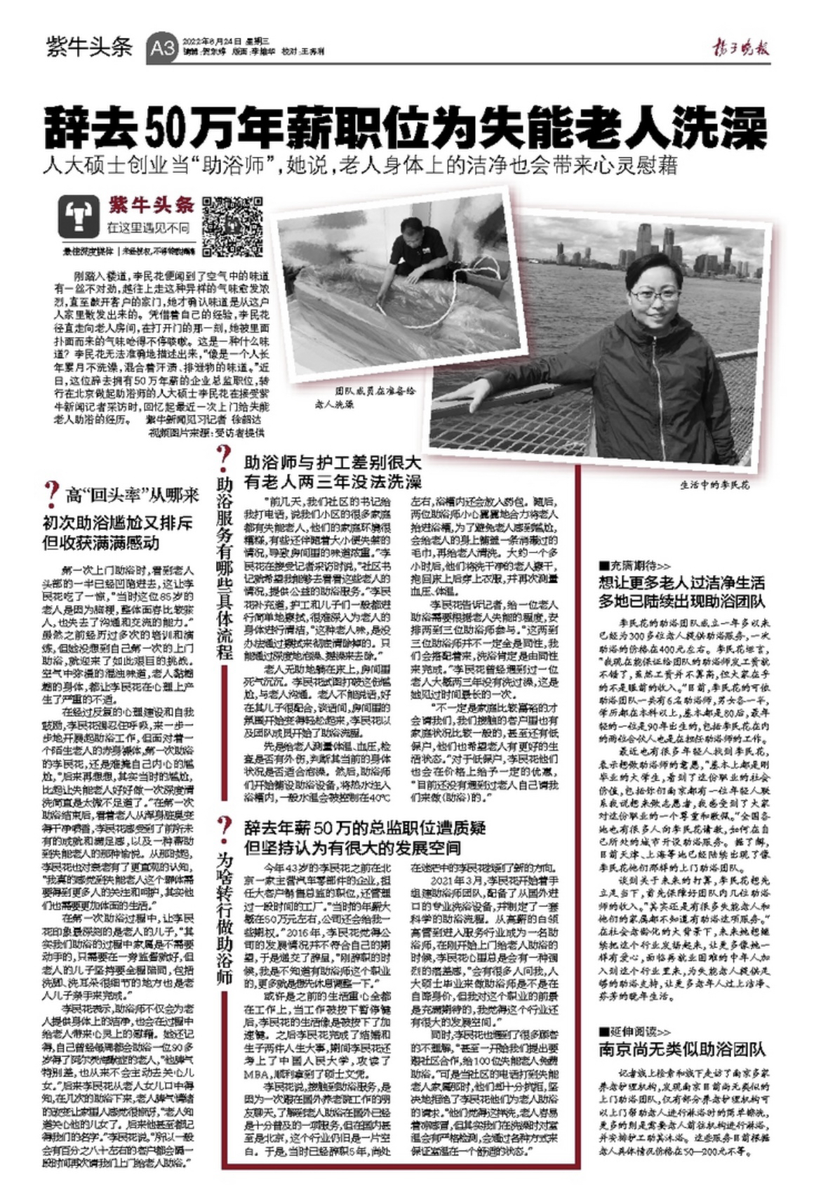2022年8月,扬子晚报紫牛新闻曾经报道过《辞去年薪50万职位,人大硕士创业当“助浴师”为失能老人洗澡》,以一位43岁中国人民大学硕士李民花创业的视角,对给老人上门助浴这项养老服务里细分行业进行了详细的介绍。在本报报道发出后,央视新闻等多家媒体在很长一段时间里对老人助浴这个行业进行跟进报道,一度让助浴服务“火出圈”。在新春佳节之际,扬子晚报紫牛新闻记者时隔半年再次对助浴师李民花进行了回访。