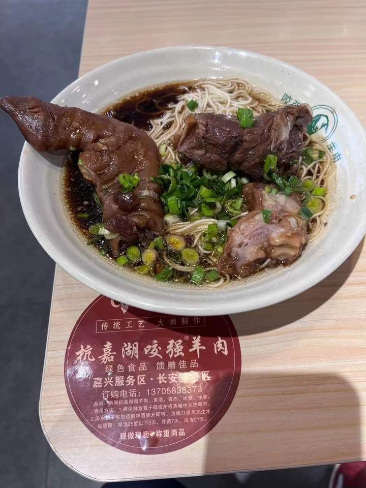 沈先生春节假期也去打卡了嘉兴服务区,特意吃了网红咬强羊肉面。