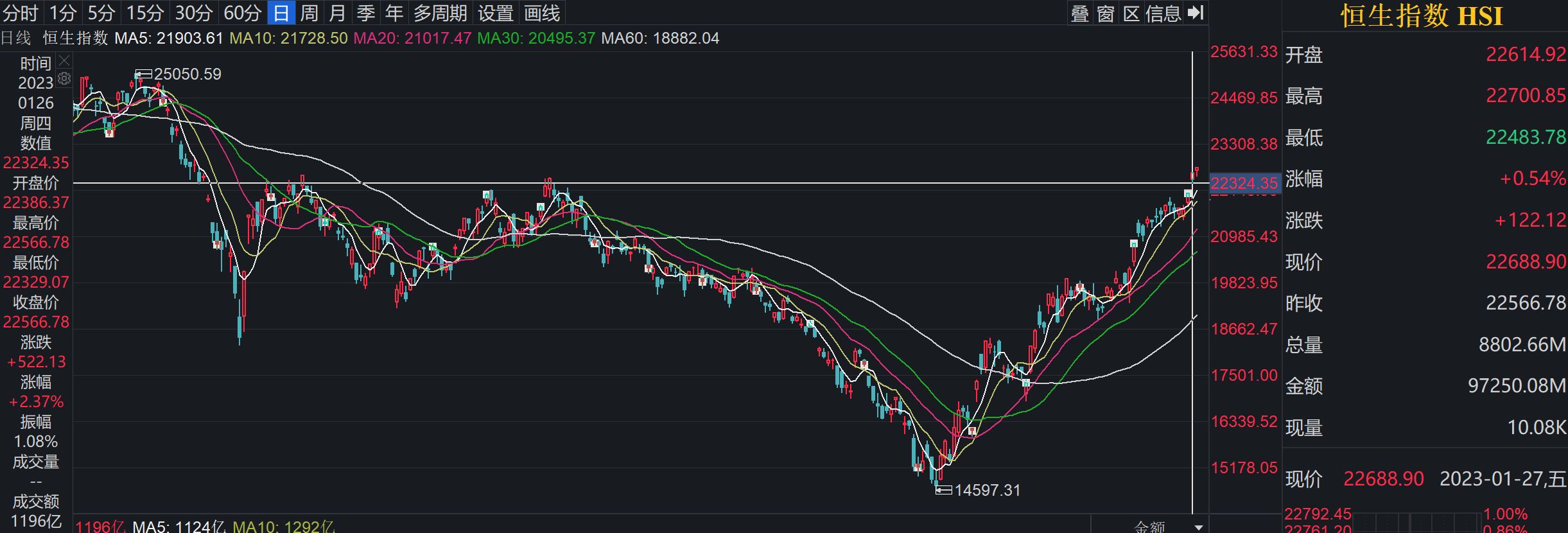 据同花顺iFinD,1月26日,兔年的第一个交易日,恒生指数以22386.37点开盘,以22566.78点收盘,涨522.13点,涨幅2.37%。