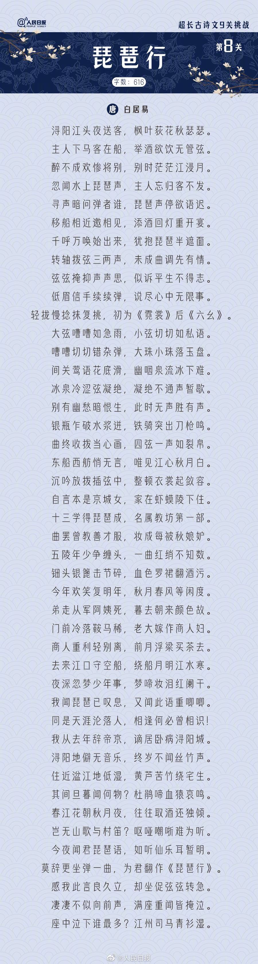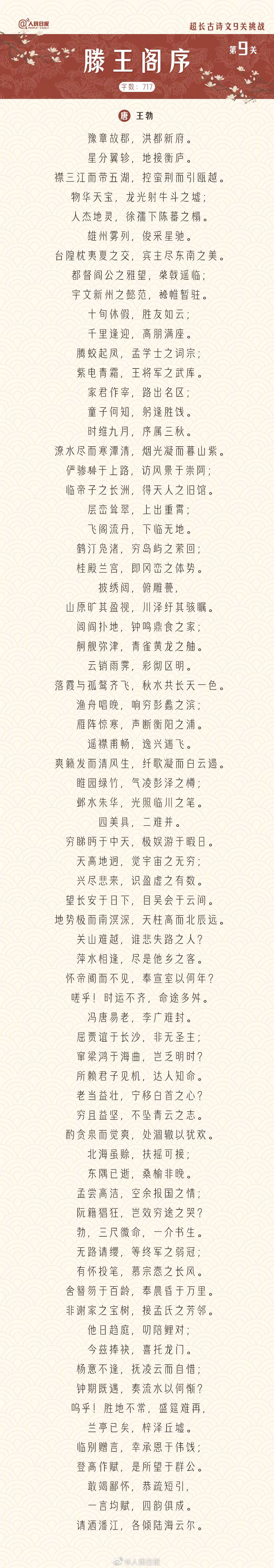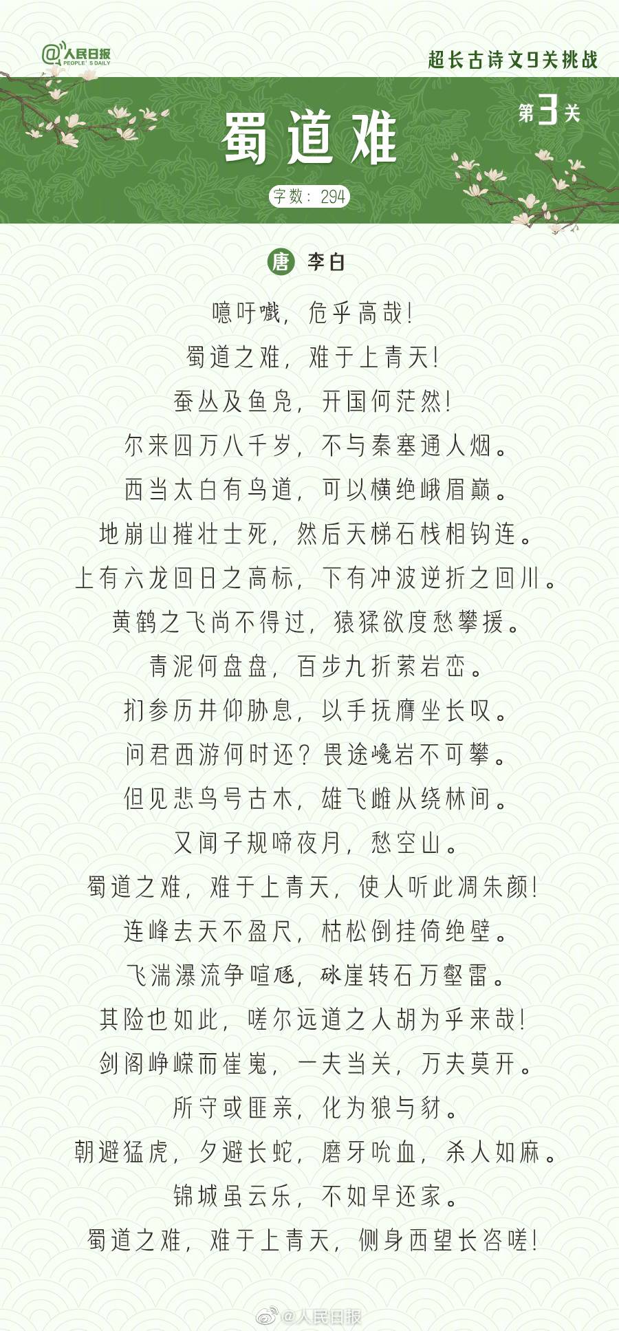 这个春节假期,岳飞庙、剑门关等景区推出“背诵古诗文免费游景区”等活动,不少游客下场挑战。294字的《蜀道难》,330字的《木兰辞》,616字的《琵琶行》。网友:儿时总有些意想不到的高光时刻,比如#你曾全文背诵过717字的滕王阁序#!9首古诗文↓快挑战!