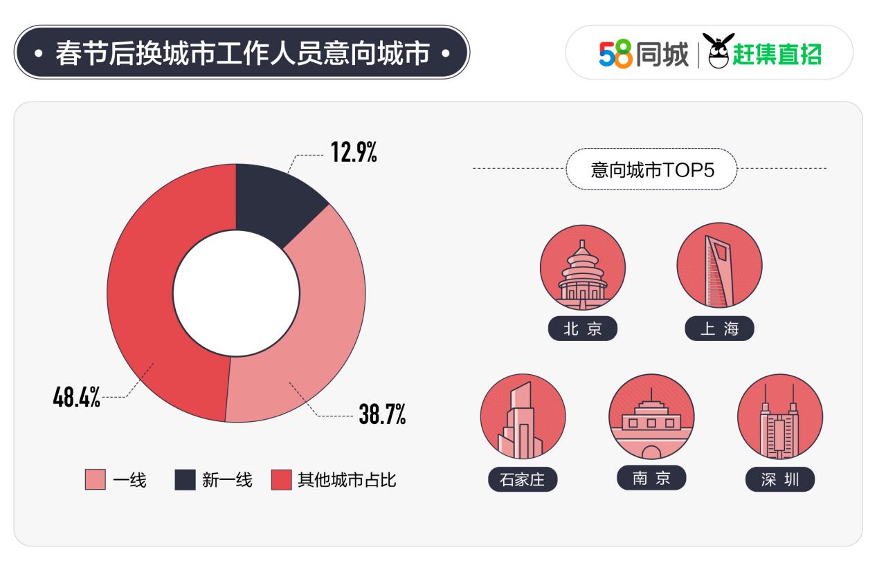 春节长假是部分职场人工作的转折期,因此也有一部分求职者受到生活理念、薪资等因素的影响,选择跳槽换岗或去另一个城市工作。报告显示,上海、广州、北京、深圳一线城市选择春节后换城市工作的比例最高,新一线城市中,成都、郑州、青岛选择春节后换城市工作的比例最高,春节后意向城市中北京、上海的比例最高。