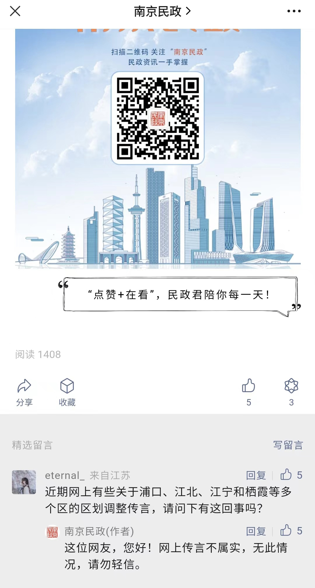 扬子晚报网 2月11日讯(记者 姜婧仪)近期,网上流传着南京关于浦口、江北、江宁和栖霞等多个区的区划调整的传言。记者从南京民政官方微信号看到相关回复:网上传言不属实,无此情况,请勿轻信。