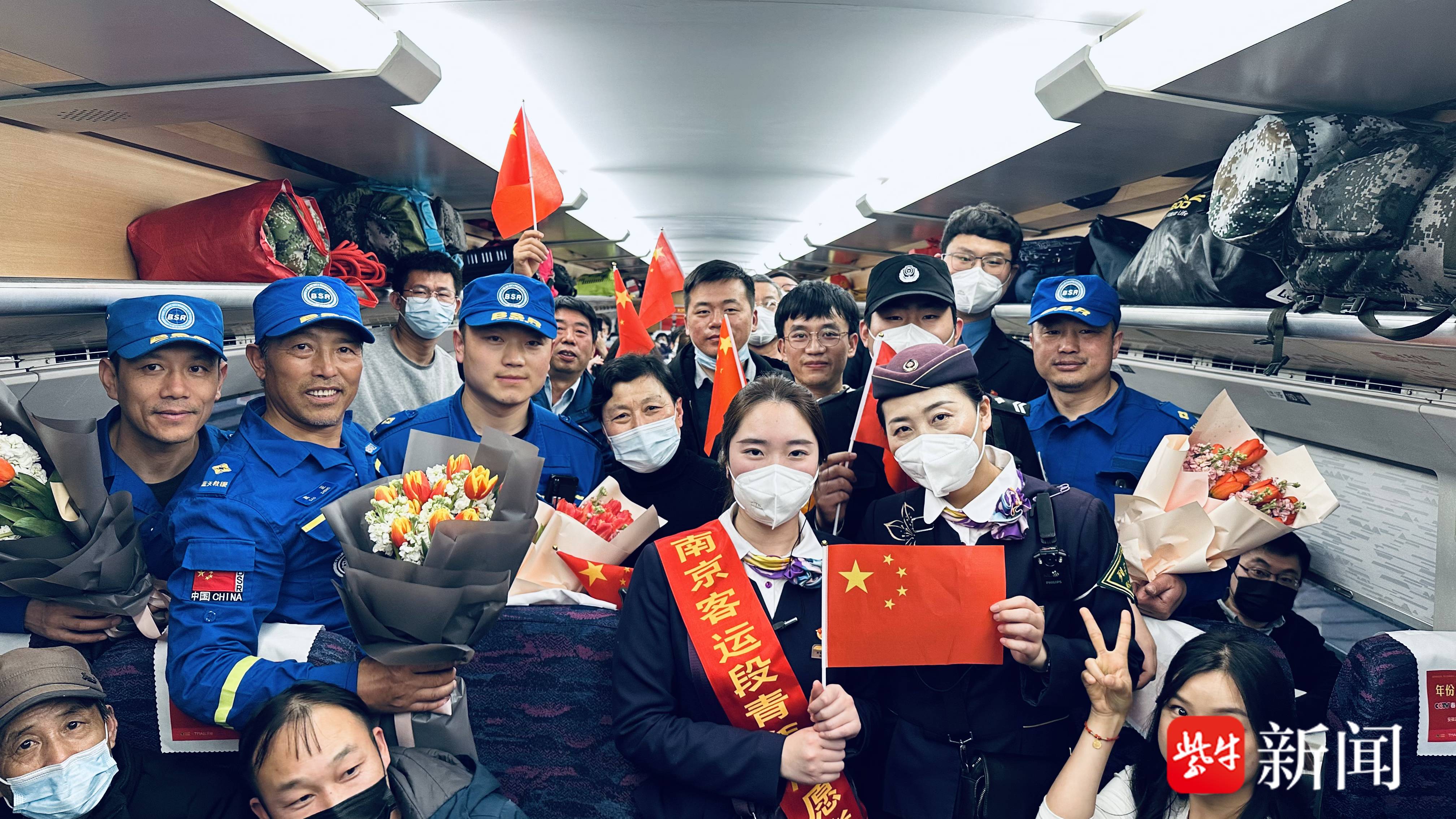 “感谢你们奋不顾身,为国争光,顽强拼搏圆满完成国际救援任务,欢迎英雄们乘高铁回家!”列车长胡小卉代表乘务组向四名勇士送去了最真诚的祝福,车厢旅客纷纷自发鼓掌欢迎勇士回家。欢迎仪式后,列车长为蓝天救援队的四名勇士讲解了列车配套设备设施,送去了茶水,全力保障旅途舒适。