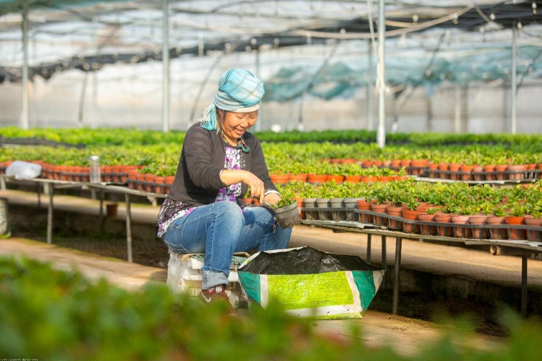 在嵩明县的一座鲜花基地,二十多位嬢嬢正在悉心打理绣球花的幼苗。再过半个月,这些绣球花就将登陆拼多多的直播间,为广大消费者送去春天的气息。