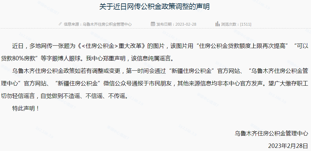 乌鲁木齐住房公积金政策如若有调整或变更,第一时间会通过“新疆住房公积金”官方网站、“乌鲁木齐住房公积金管理中心”官方网站、“新疆住房公积金”微信公众号通报于市民朋友,其他来源信息均非本中心官方发声。望广大缴存职工切勿轻信谣言,自觉做到不造谣、不信谣、不传谣。