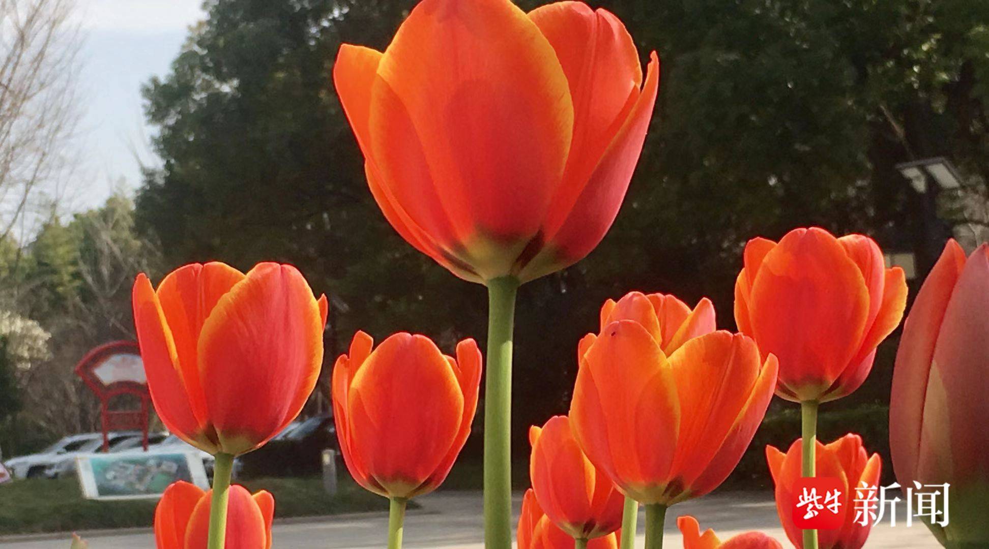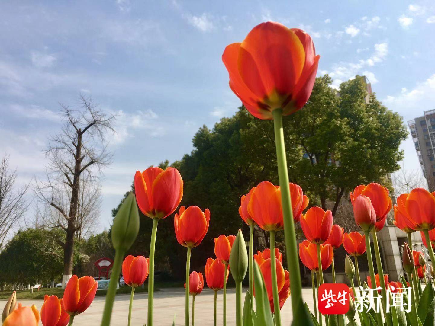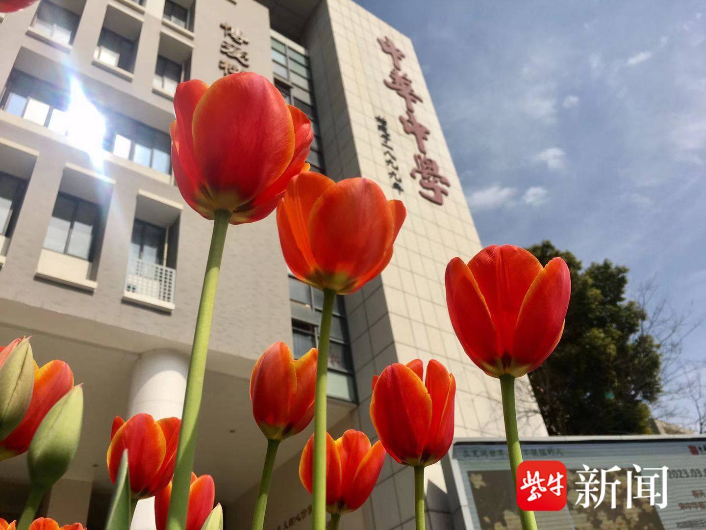 扬子晚报网3月7日讯(通讯员 徐福庚 记者 董婉愉)阳春三月,春花烂漫,正是花开的好时节。这两天,记者在南京河西兴隆大街中华中学看到,校园内的郁金香惊艳盛放,镶着金边的橙红色郁金香花朵初绽,在蓝天白云衬托下美不胜收,也把校园春色装扮得更加美丽迷人。