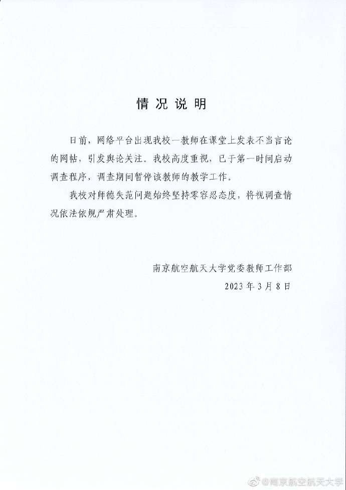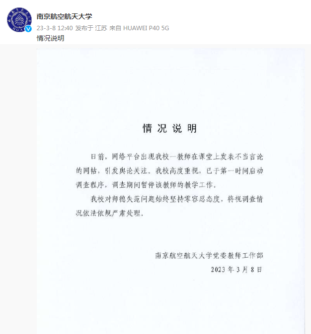 教师在课堂上发表不当言论,南京航空航天大学:第一时间启动调查程序