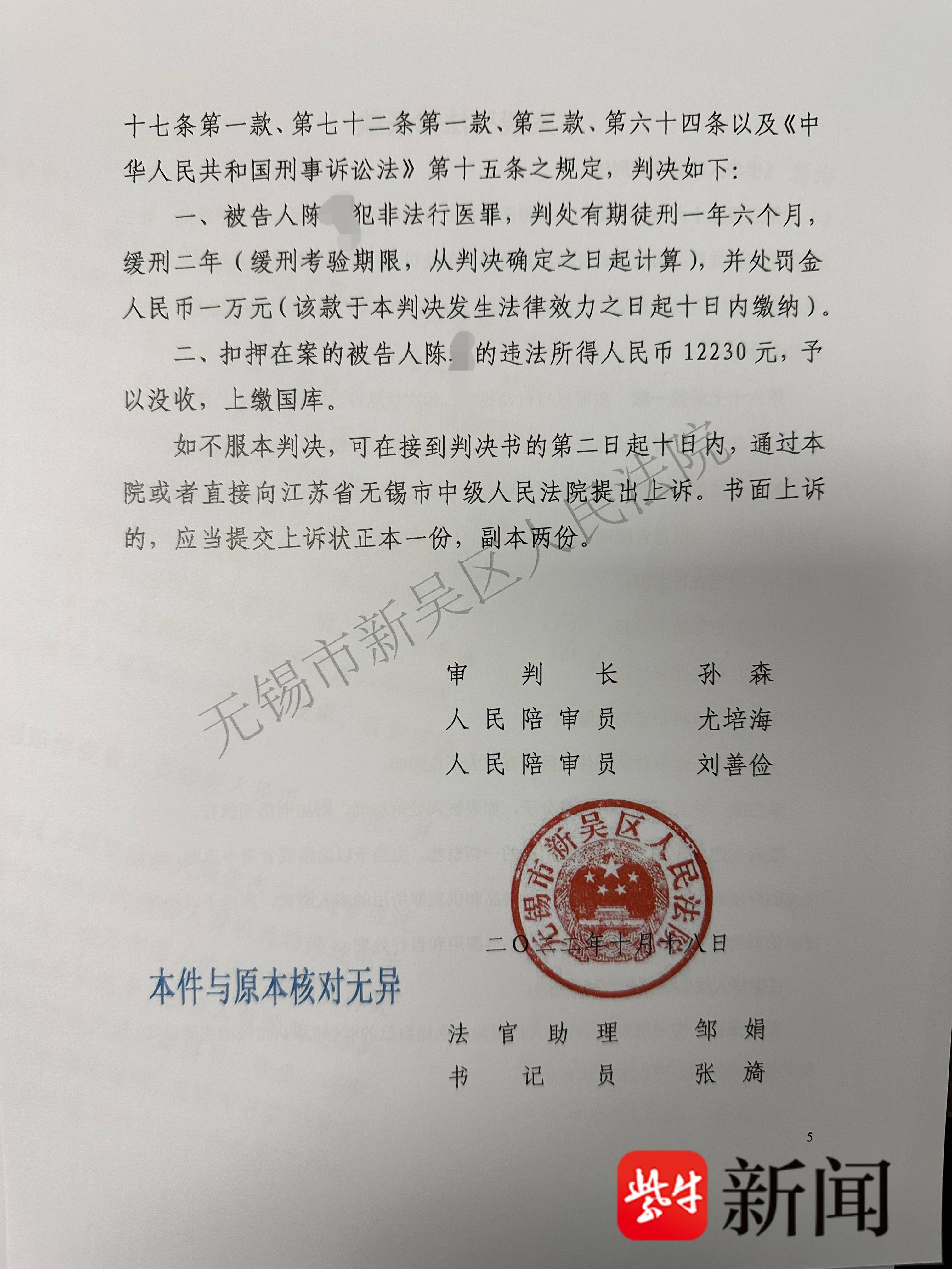 在无锡一医美机构担任业务员的陈某,工作期间围观过医生做提眉、祛眼袋手术的全过程,觉得活好干且钱好赚,遂决定一边“偷师”一边自己练习,并以低价上门服务,还真做成了几单。直到一个客人因她的“手术”失明而事发,陈某也被判刑并处罚金,赔偿了受害人一大笔钱。