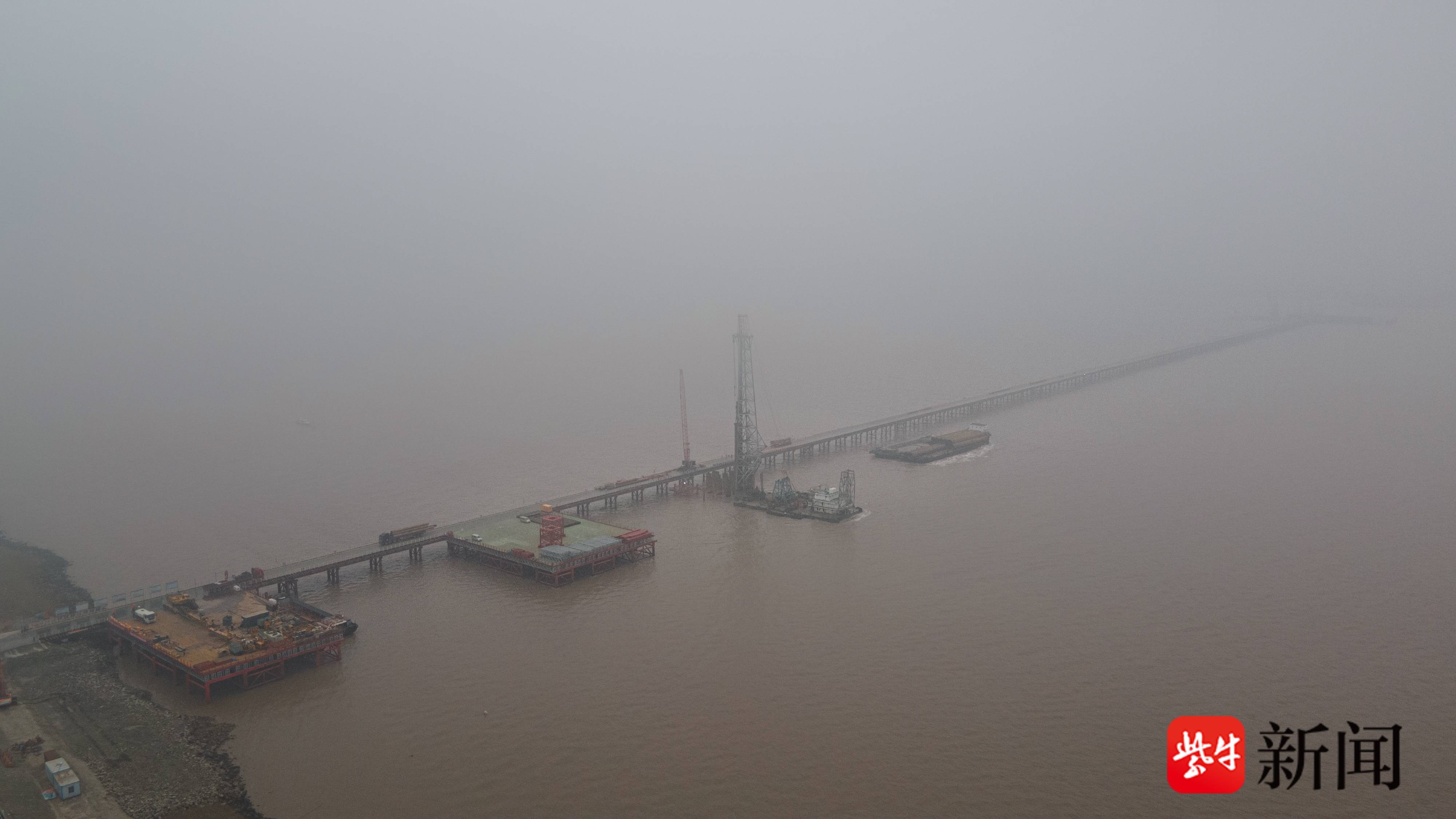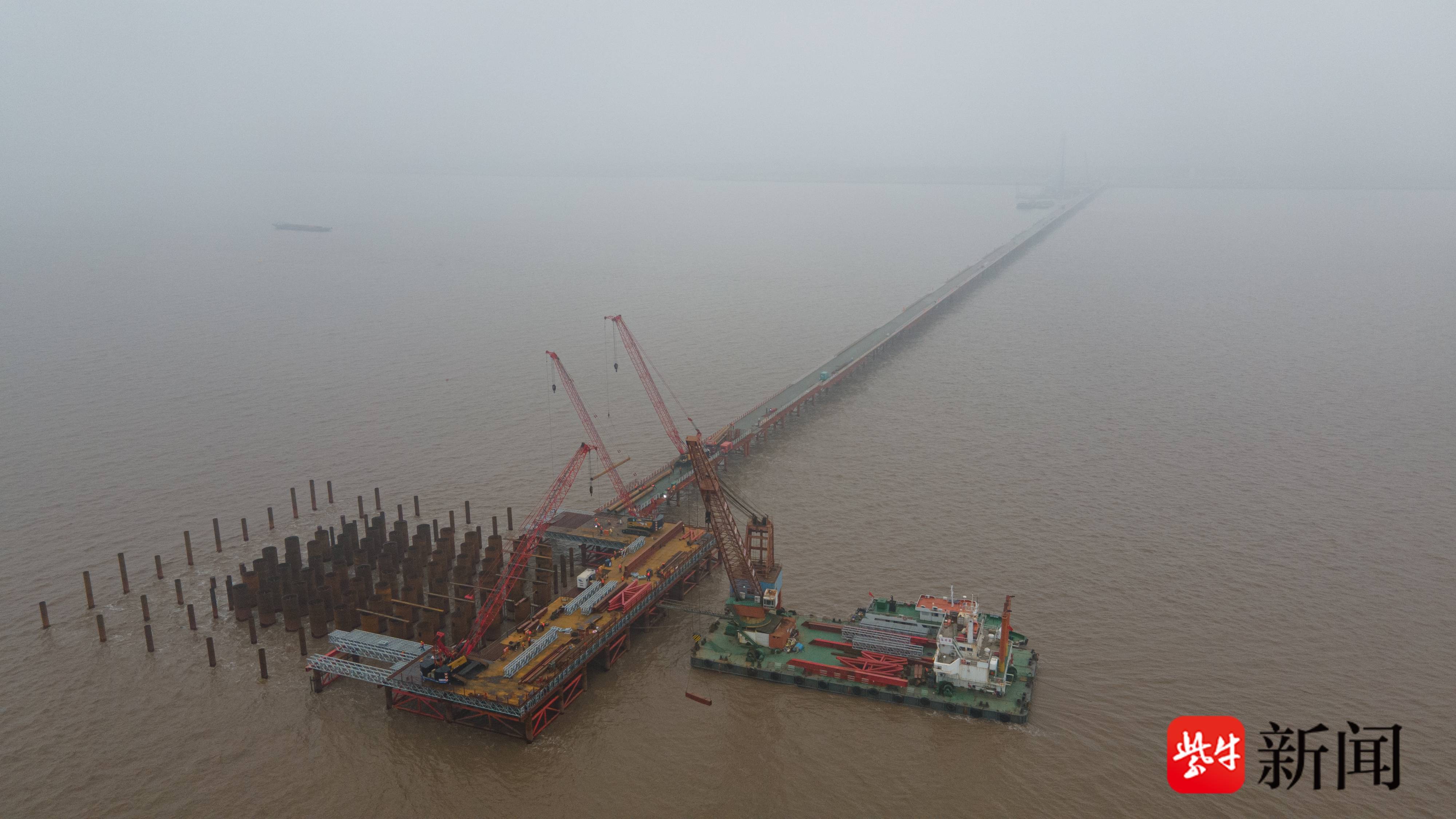 北沿江高铁崇启公铁长江大桥加快建设,南岸主栈桥铺设完工