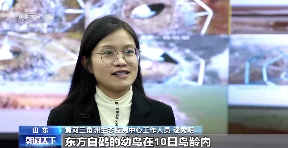 黄河三角洲生态监测中心工作人员逯秀明:东方白鹳的幼鸟在10日鸟龄内,亲鸟是要轮流去获取食物,给他们喂养一些小鱼小虾等等这些水生食物,所以说自然保护区内水源充足,能给他们提供充足的食物,保证了繁殖期东方白鹳的抚育。