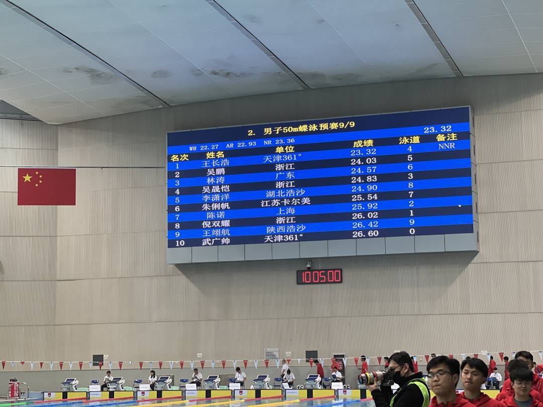 在刚刚结束的2023年全国春季游泳锦标赛男子50米蝶泳预赛中,天津队选手王长浩以23秒32的成绩打破李朱濠保持的全国纪录(23秒36)。这是本次锦标赛创造的首个纪录。