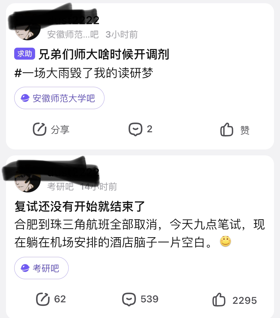考生发帖称因天气原因飞机延误自己错过复试