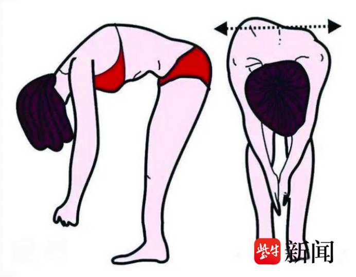 双脚伸直并拢,与肩同宽;双手指指向脚尖,身体弯腰90°;从后方观察其背部两边高低是否等高,如果发现一边高一边低,则有可能存在脊柱侧弯。
