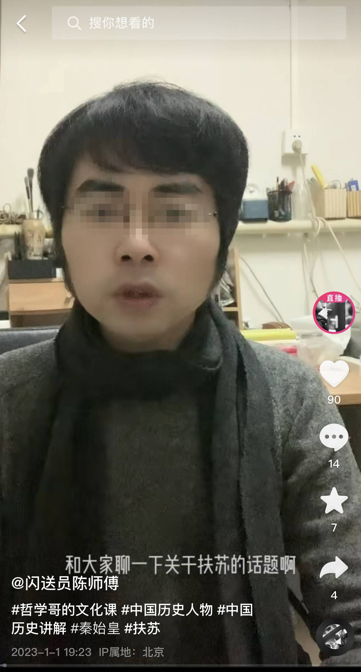 有时候他会穿着黑色长衫,披着灰黑色围巾,以学者的风范在抖音上聊历史、哲学、文化,例如“秦始皇嬴政”“秦始皇长子扶苏之死”“庄子”“西方存在主义”“生死哲学”等话题;更吸引大家眼球的还是,他戴着头盔,骑着电驴,当外卖员的经历。这两种生活像是两个世界,如今却融合发生在他的身上。