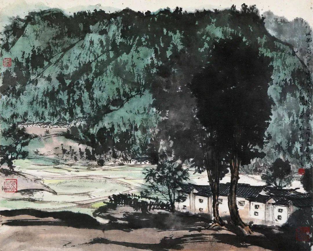 傅抱石《井冈山风光》作于1964年,作品中已全然显示出傅抱石新的笔法特征。远景中平缓连绵的厚重山体,轮廓清晰,近景处清晰透亮的树木房屋,层次分明,散锋乱笔表现山石结构的「抱石皴」,自由散漫、磅礡多姿。1965年9月,傅抱石应上海市委的邀请,承接新落成的虹桥国际机场创作壁画的任务,题材确定为井冈山。不幸的是,画家9月底突发意外去世,此作正是当年准备绘制虹桥机场壁画前所作的底稿之一。作品未及署款,仅钤有傅抱石用印「抱石私印、其命维新、抱石得心之作」三方印章,1980年,由傅抱石遗孀罗时慧补题于上:此抱石一九六四年旅行写生之作,余颇赏之,惜未及题款,因为之补记,庚申(1980年)秋,罗时慧。附三次权威出版。