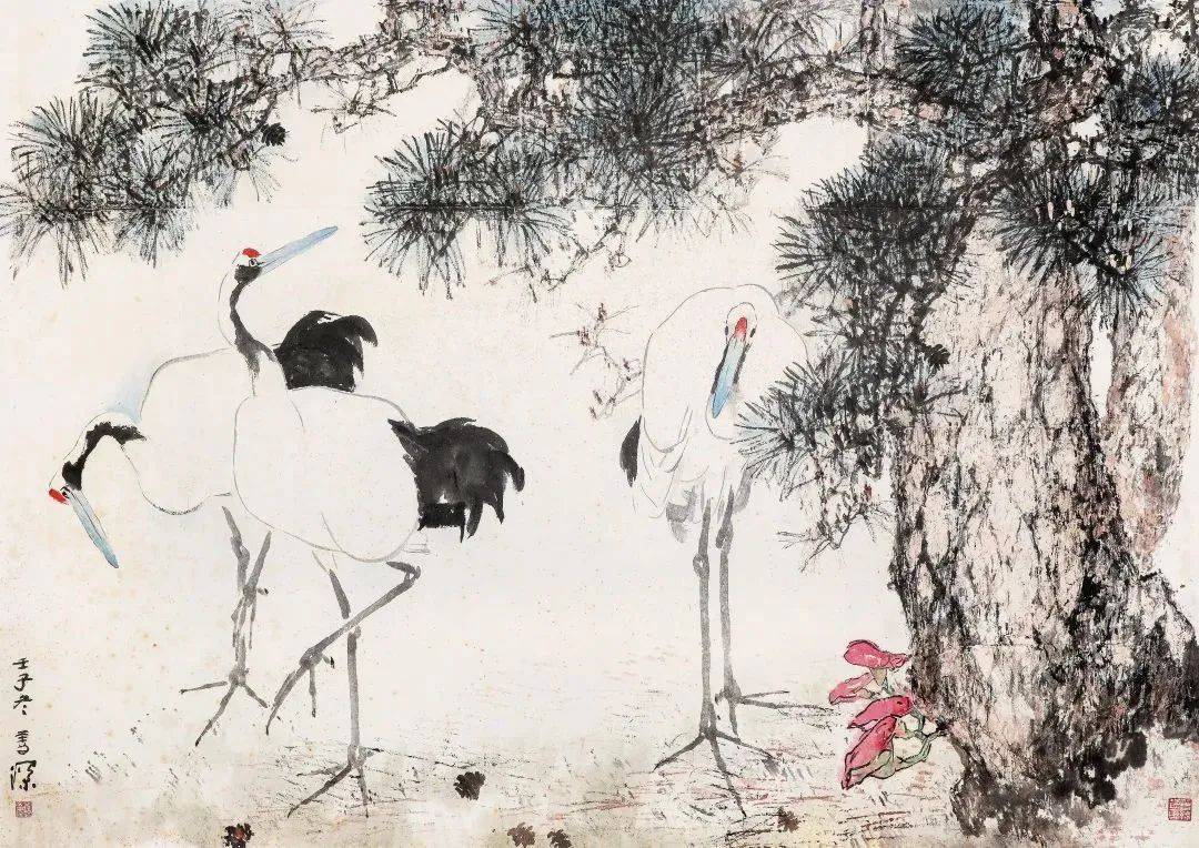 杨善深《松鹤图》出版物封面 杨善深先生在秉承了岭南画派的写生传统之外,兼具创新精神。长期的笔墨实践,外师造化中得心源,既描绘了真实的山水动物画面,又创造出画外之境。《松鹤图》为画家精心绘制的宏伟之作,作品尺幅巨大,构图巧妙,笔触细腻,以简练的笔墨将岭南画派长于状物传神的写实技巧发挥到极致,其充满灵活气息的笔墨语言,巧拙互用,雄放而不失秀雅,生动活泼,古典的绘画题材亦充满了现代审美气息。