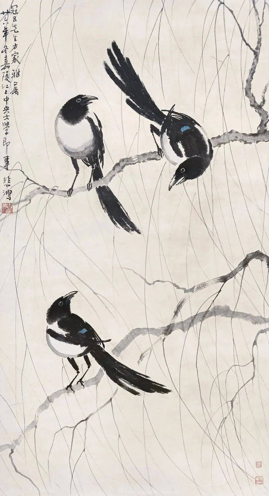 徐悲鸿 三喜图 设色纸本 镜框 款识:冠五先生方家雅属。廿六年(1937)冬嘉陵江 上中央大学即事,悲鸿。钤印:悲鸿之画 鉴藏印:冠五清赏、田溪书屋 出 版:《百年鸿程 逐梦1919》,徐悲鸿文献及师生 作品展,P029。 RMB: 2,800,000-4,800,000 徐悲鸿《三喜图》 出版物封面 《三喜图》为徐悲鸿先生1937年写赠广州大商人、收藏家何冠五的作品,三只喜鹊高站枝头,灵巧的身躯和纵横的柳枝交相成局,构成疏密、轻重、动静等对比关系。喜鹊们顾盼生姿,柳条微微右摆,彷彿微风吹拂于画面,以构图的张力传达了开阔的生机。在物象造型,悲鸿突破传统,在喜鹊背、尾交接处染上小块青色,表现成鸟的黑羽中隐隐泛出的蓝紫光泽。以北碑楷书间掺行草的笔法来画枝条,正锋与偏锋并用,表现出柳枝老嫩相生,并伴随风飞鸟跃的飘逸感,真正达到了以形显神的境界。