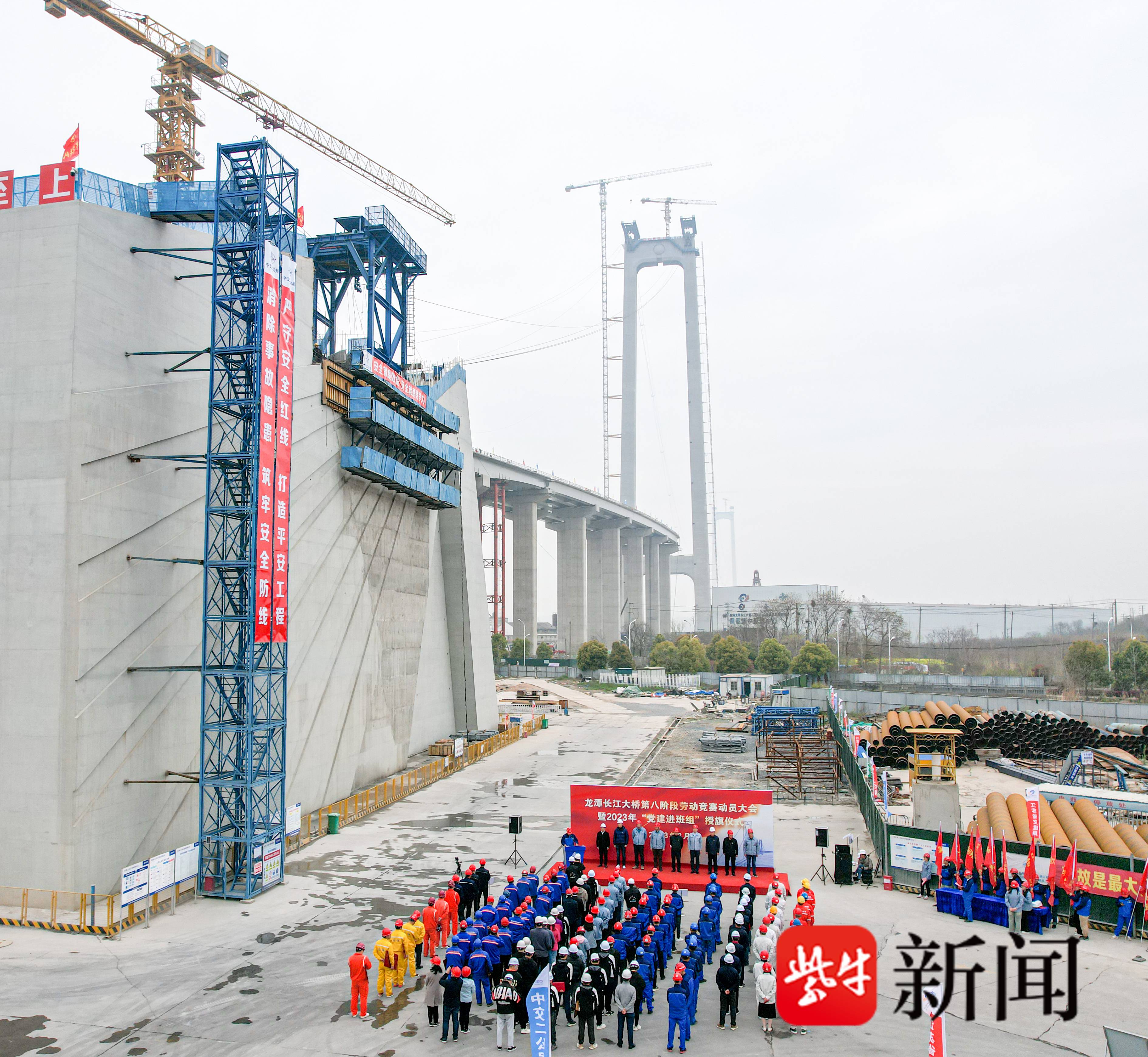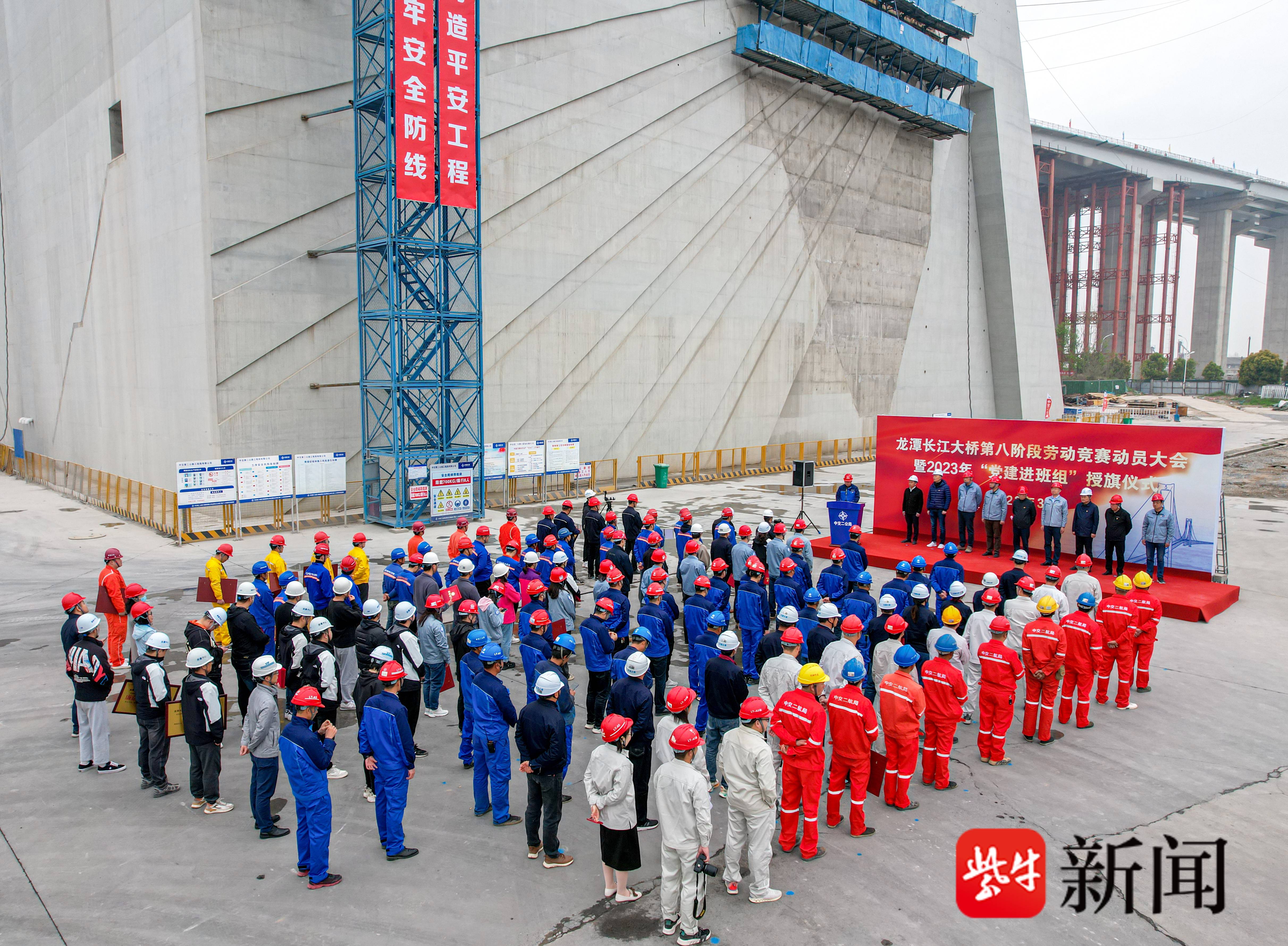 扬子晚报网4月1日讯(记者 石小磊)3月31日,龙潭长江大桥开展第八阶段劳动竞赛动员大会和2023年“党建进班组”授旗,江苏省交通工程建设局副局长夏国星、龙潭长江大桥建设指挥部现场指挥长胡尧,中交二公局二公司党委书记、董事长黎训国等出席活动。